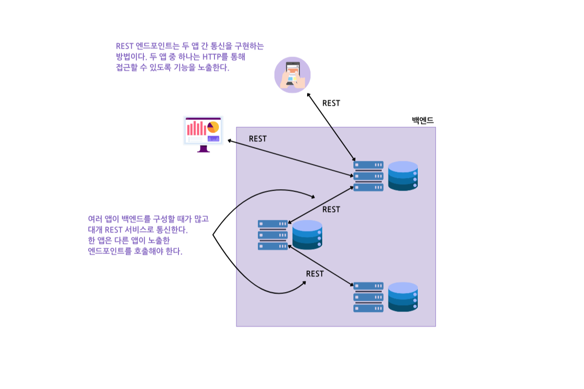- RestTemplate: 스프링 3부터 개발자들이 REST 엔드포인트를 호출하는 데 사용하여 널리 알려진 도구. 저자는 새로운 앱에서 작업한다면 RestTemplate 대신 OpenFeign을 추천함.