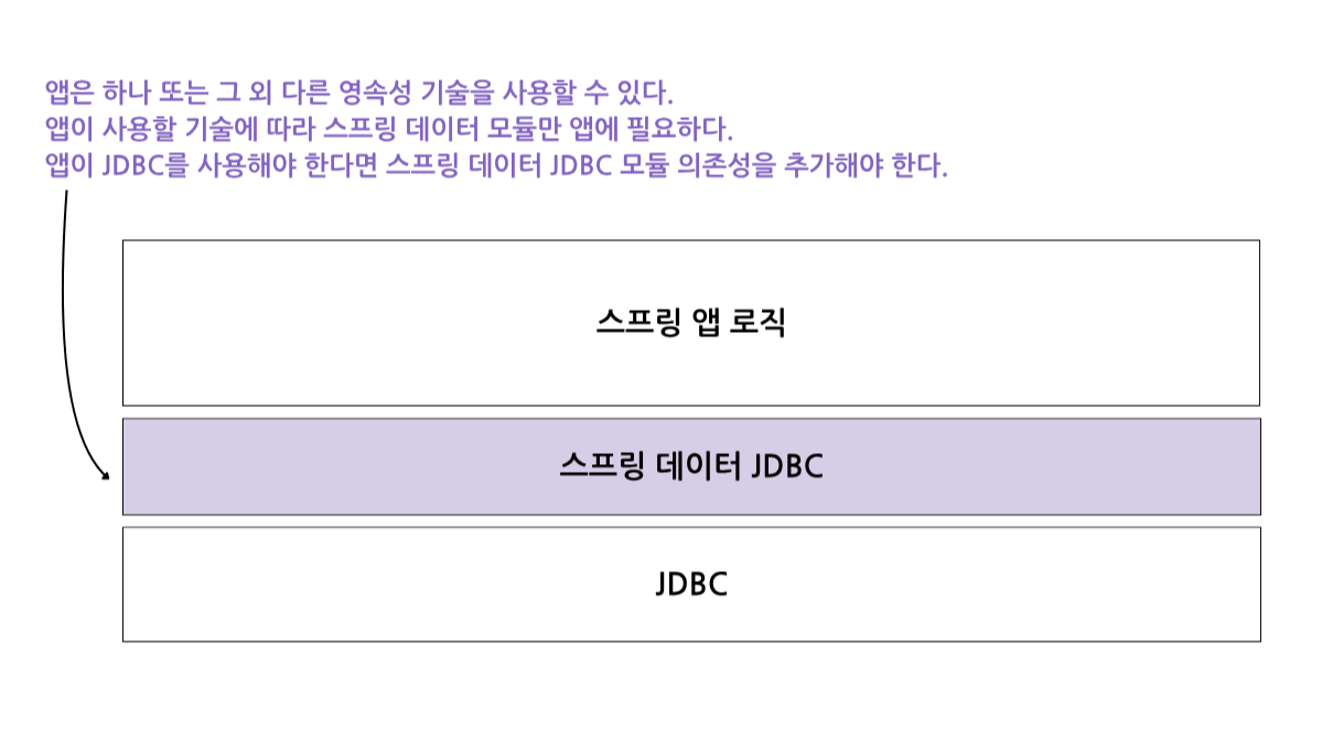 - 스프링 데이터 프로젝트는 스프링 데이터가 지원하는 영속성 방식에 따라 하나의 메이븐 의존성을 제공한다. 스프링 데이터 JDBC 모듈을 사용하여 JDBC로 DBMS에 직접 연결하거나, 스프링 데이터 Mongo 모듈을 사용하여 MongoDB 데이터베이스에 연결할 수 있다.