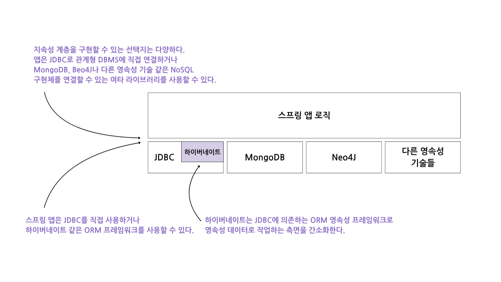 - 스프링 데이터(Spring Data): 영속성 기술에 맞는 구현을 제공하는 스프링 생태계의 한 프로젝트