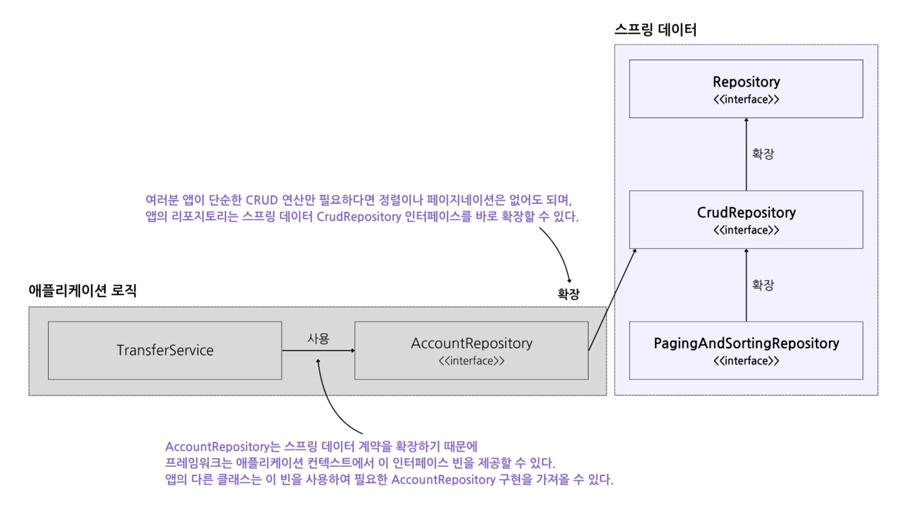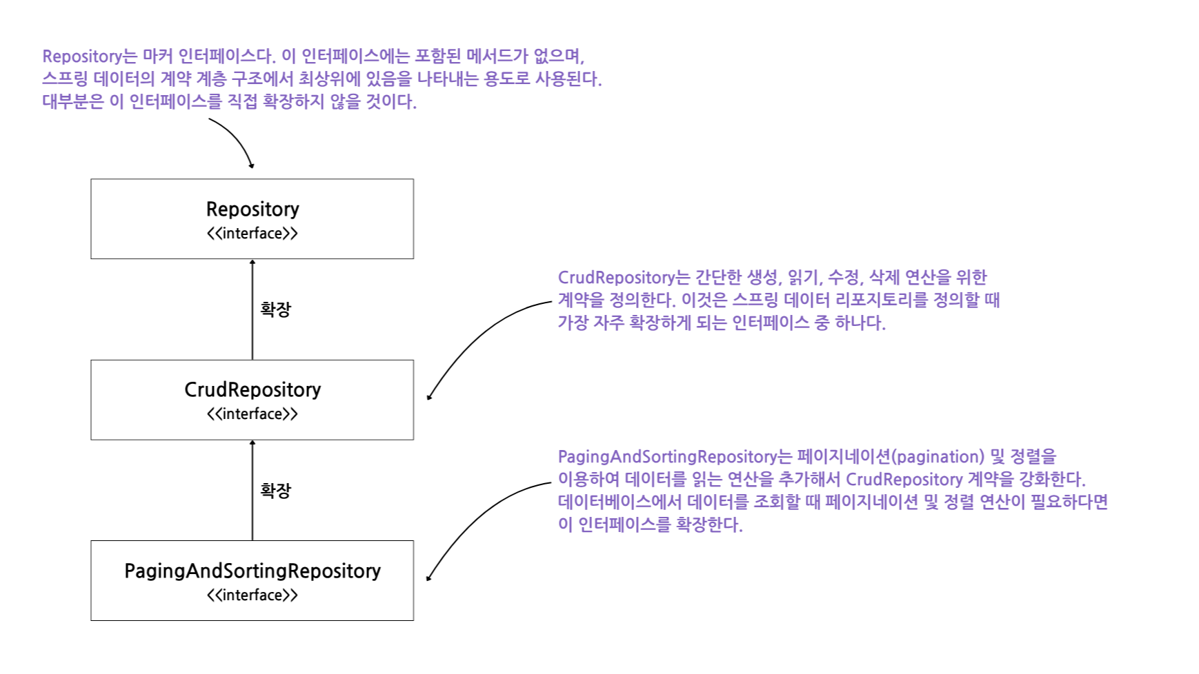 - 예) 앱에서 CRUD 연산만 사용해야 할 때는 CrudRepository 계약을 확장한다. 앱은 레코드 정렬 및 페이징과 관련된 연산을 가져오지 않으므로 단순해진다. 앱에 단순한 CRUD 연산 외에 페이지네이션 및 정렬 기능이 필요하다면 보다 구체적인 계약 형태인 PagingAndSortingRepository 인터페이스를 확장해야 한다.