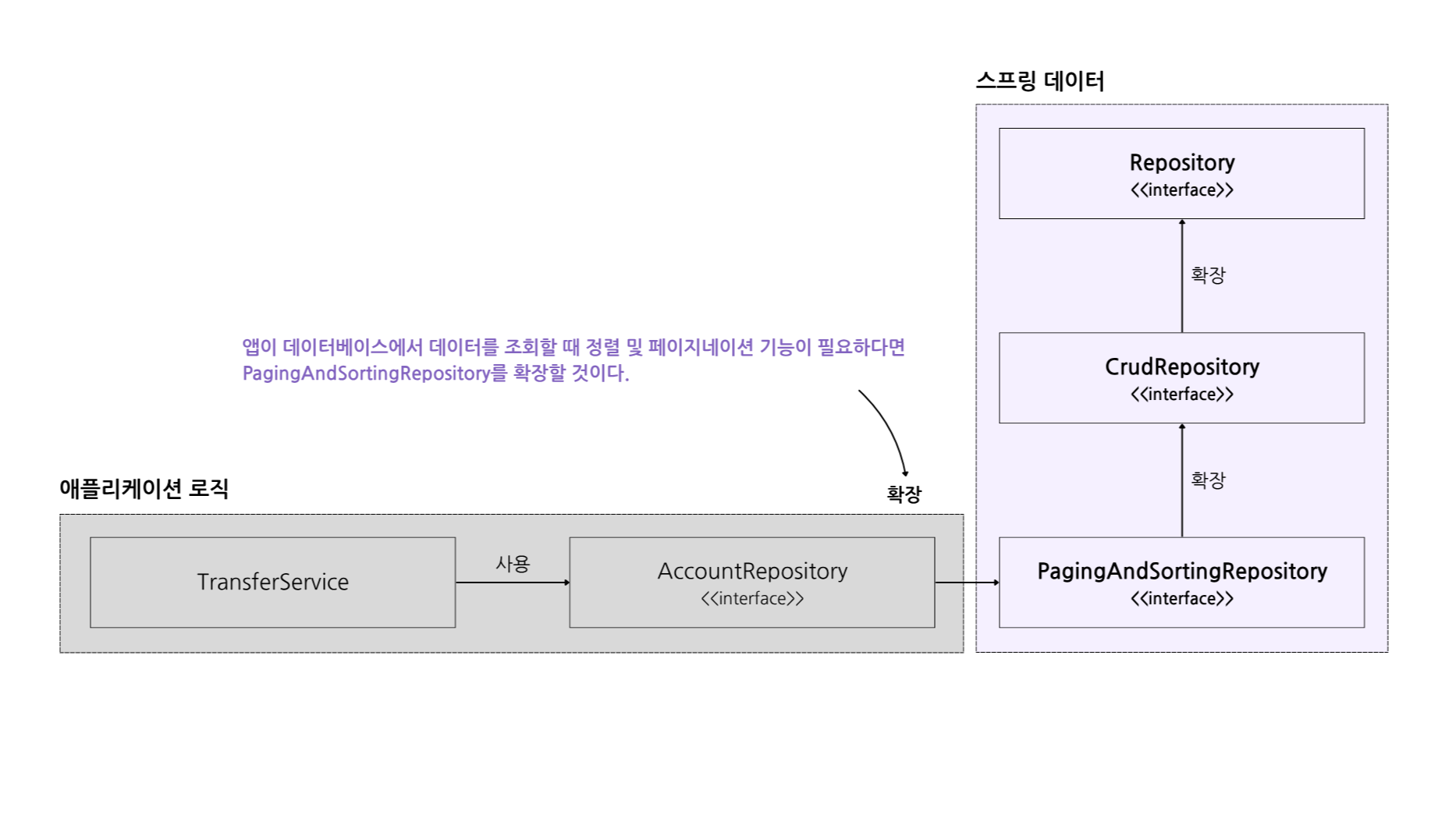 - PagingAndSortingRepository는 CrudRepository를 확장하여 레코드를 정렬하거나 특정 수(페이지) 단위로 조회하는 것과 관련된 연산 작업을 추가한다.
