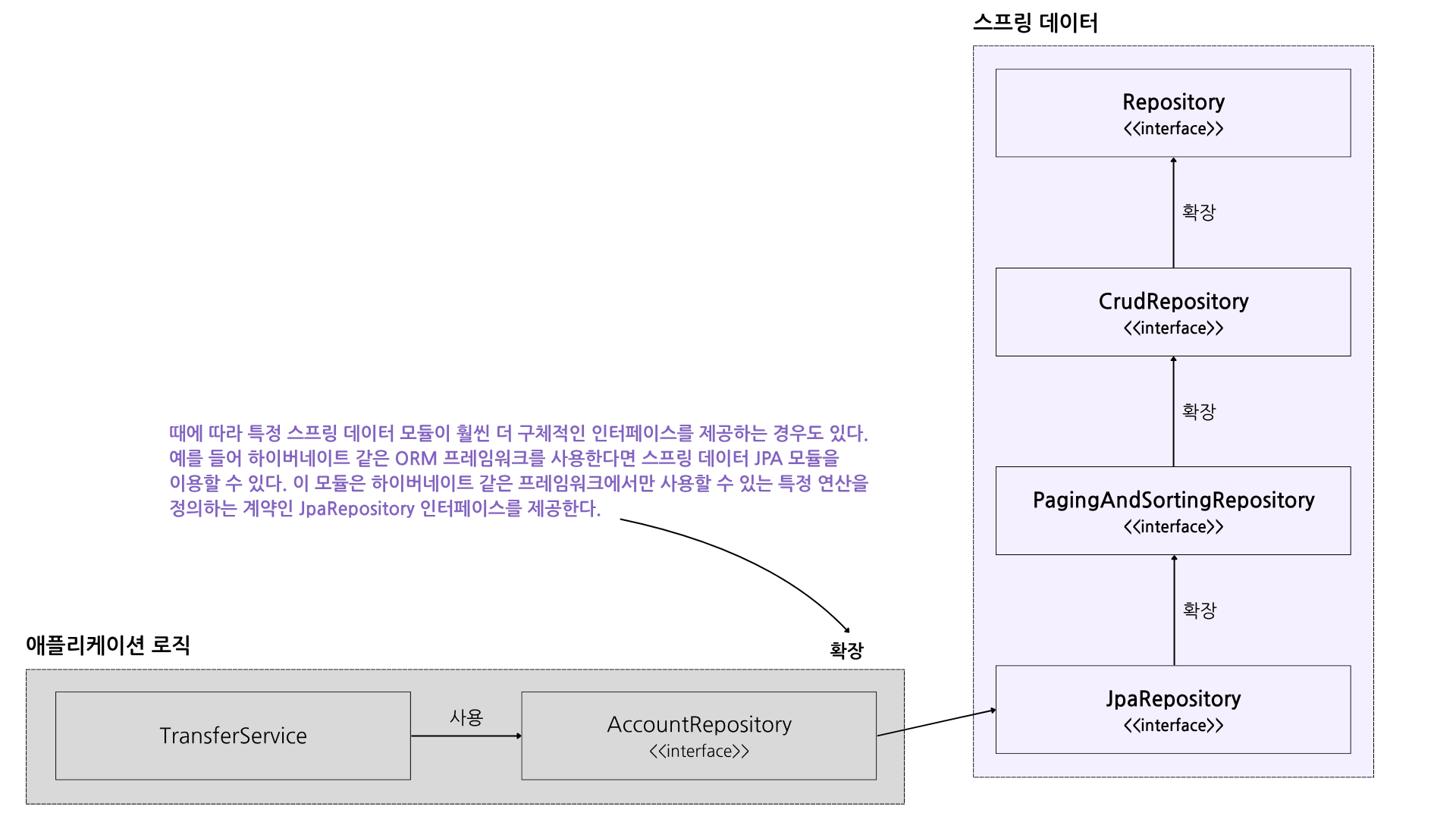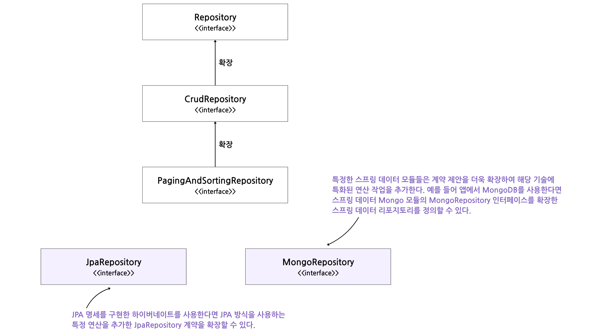 - 예) 스프링 데이터 JPA를 사용하면 JpaRepository 인터페이스를 직접 확장 할 수도 있다. JpaRepository 인터페이스는 PagingAndSortingRepository보다 더 구체적인 계약이다. 이 계약에는 하이버네이트 같은 특정 기술을 사용할 때만 적용 가능한 연산(메서드)이 추가되며, 이 기술은 JPA(Jakarta Persistence API) 명세를 구현한다.