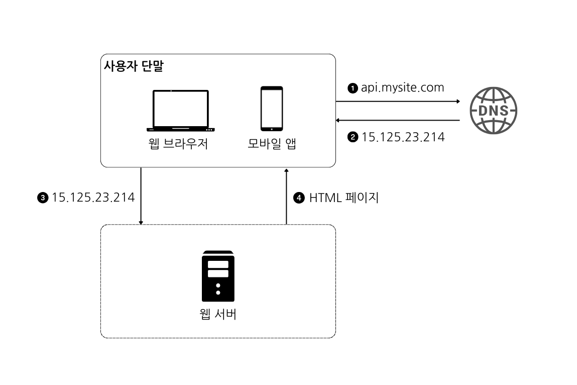 - 사용자는 도메인 이름(api.mysite.com)을 이용하여 웹사이트에 접속한다. 이 접속을 위해서는 도메인 이름을 도메인 이름 서비스(Domain Name Service, DNS)에 질의하여 IP 주소로 변환하는 과정이 필요하다. DNS는 제3 사업자(third party)가 제공하는 유료 서비스를 이용하게 되므로, 우리 시스템의 일부는 아니다.