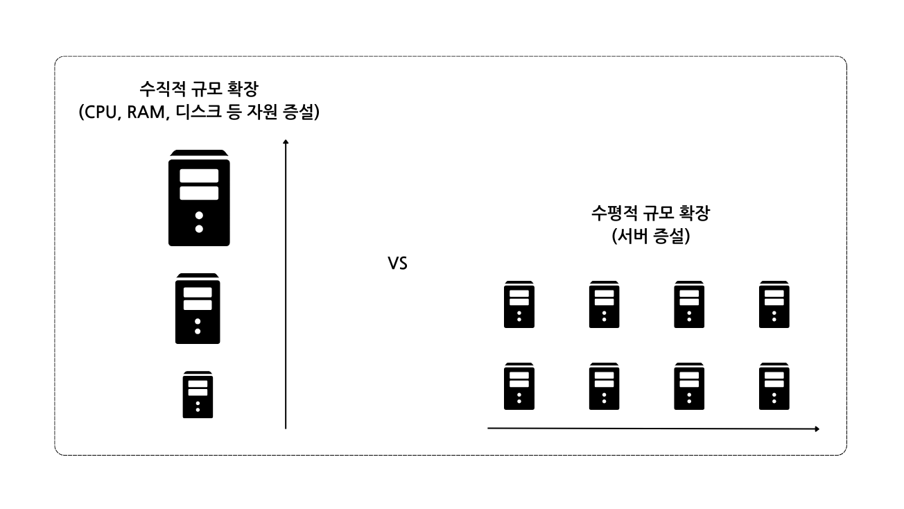 - 수평적 규모 확장(scale out)이라고도 하는 수평적 규모 확장 프로세스는 더 많은 서버를 추가하여 성능을 개선하는 행위를 말한다.