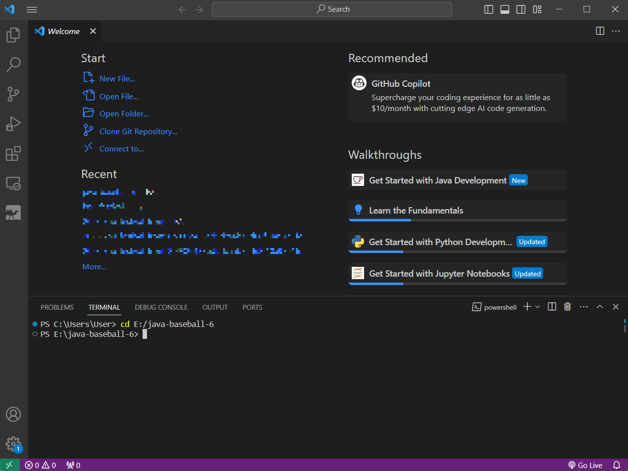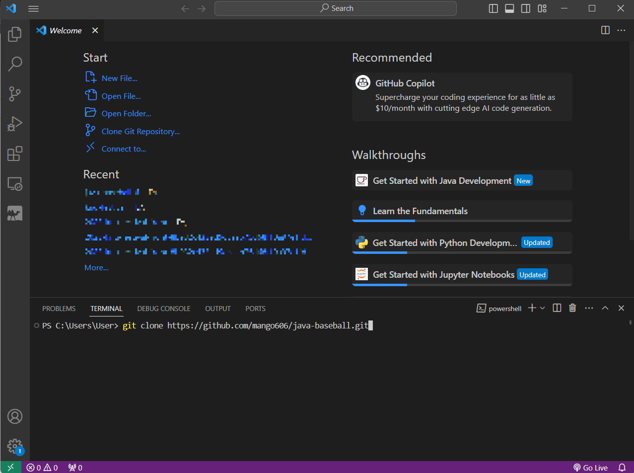 프리코스 웹 백엔드 미션 제출을 위해 VSC에서 개발 환경을 설정했다. 원래는 IntelliJ를 사용하려고 했으나, 요즘 많이 사용하고 있는 VSC를 이용하기로 했다. Eclipse에서 Java로 코딩한 경험이 있어 코드 작성에는 어려움이 없었다.