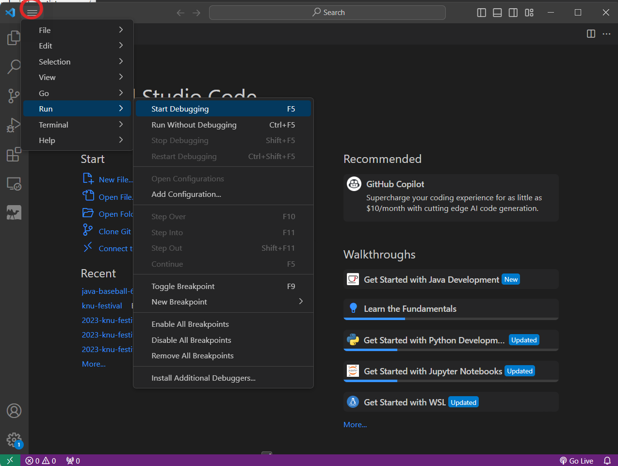 1. 메뉴 > Run > Start Debugging 를 클릭한다. (단축키 F5)