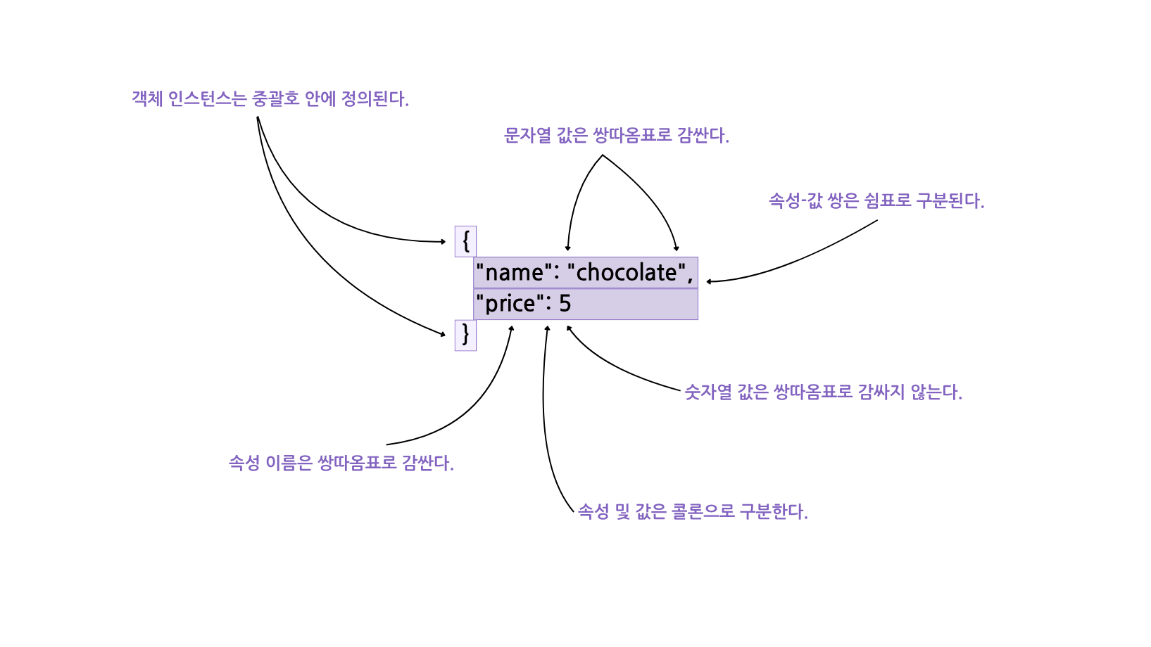 - 객체 인스턴스를 정의하기 위해 JSON에서는 중괄호({})를 사용한다.