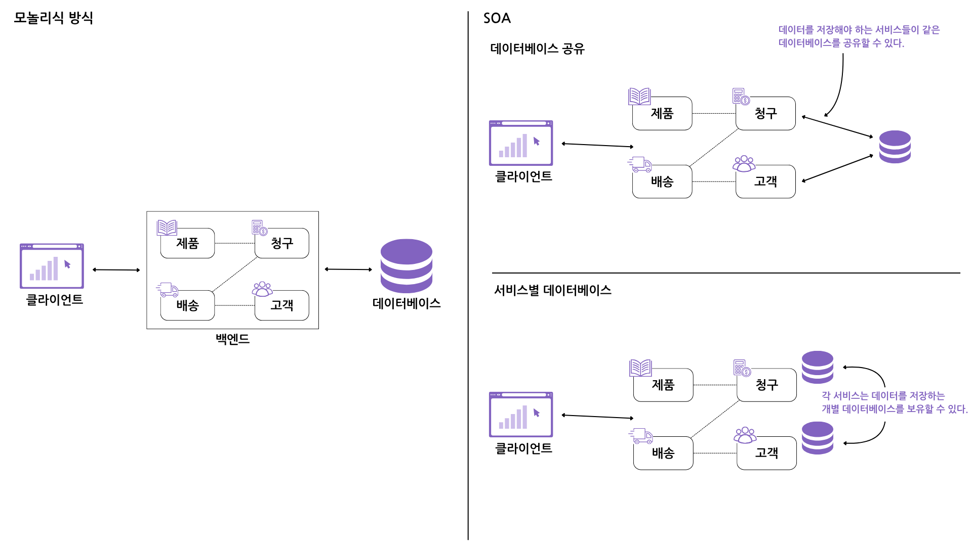 - SOA에서는 데이터를 저장해야 하는 서비스가 여러 개 존재한다. 각 서비스마다 개별 데이터베이스를 갖는 것은 어려움이 존재한다. 단일 데이터베이스로 데이터 일관성을 확보하는 것이 훨씬 쉽다. 독립된 데이터베이스가 늘어날수록 모든 데이터의 일관성을 유지하는 일은 어려워진다.