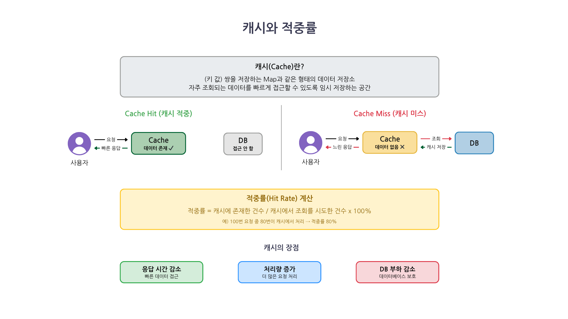- 적중률 = 캐시에 존재한 건수/캐시에서 조회를 시도한 건수
