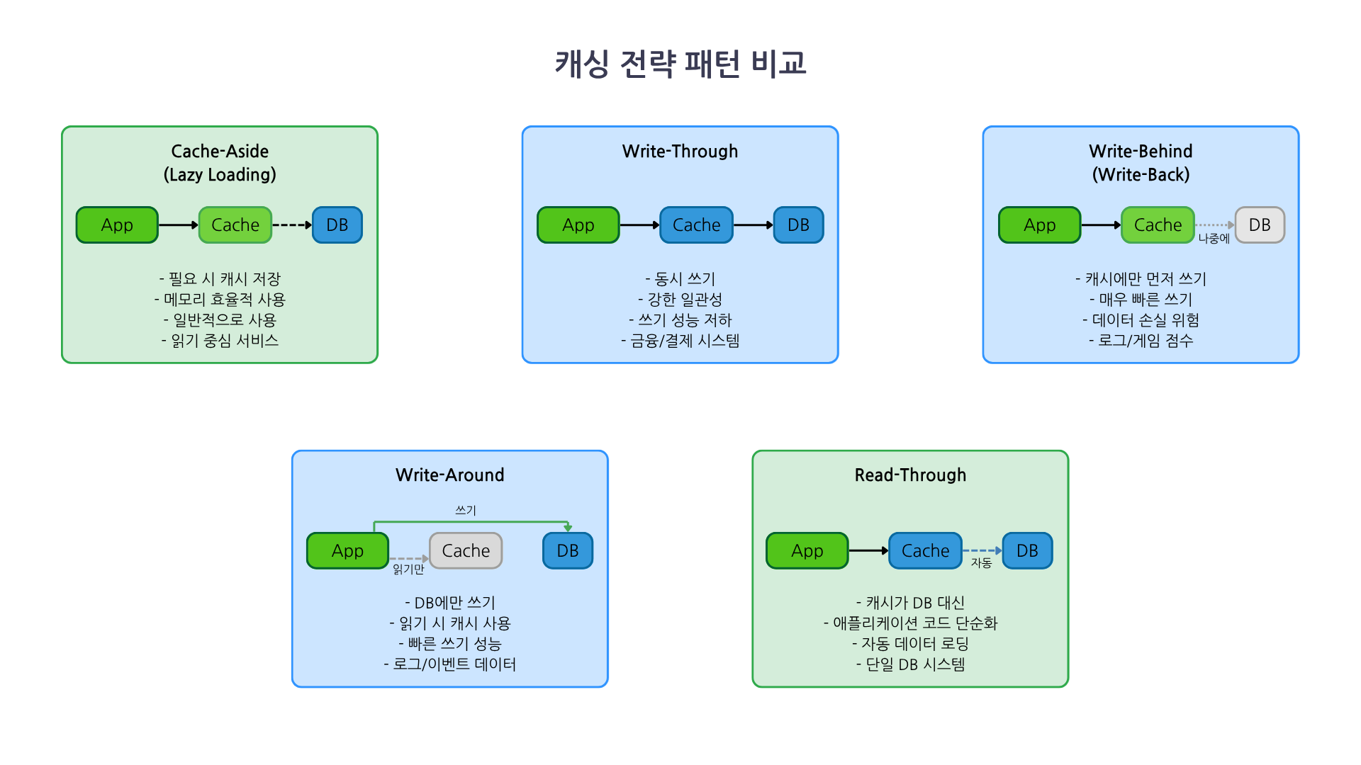 - 쓰기: DB 업데이트 → 기존 캐시 데이터 삭제