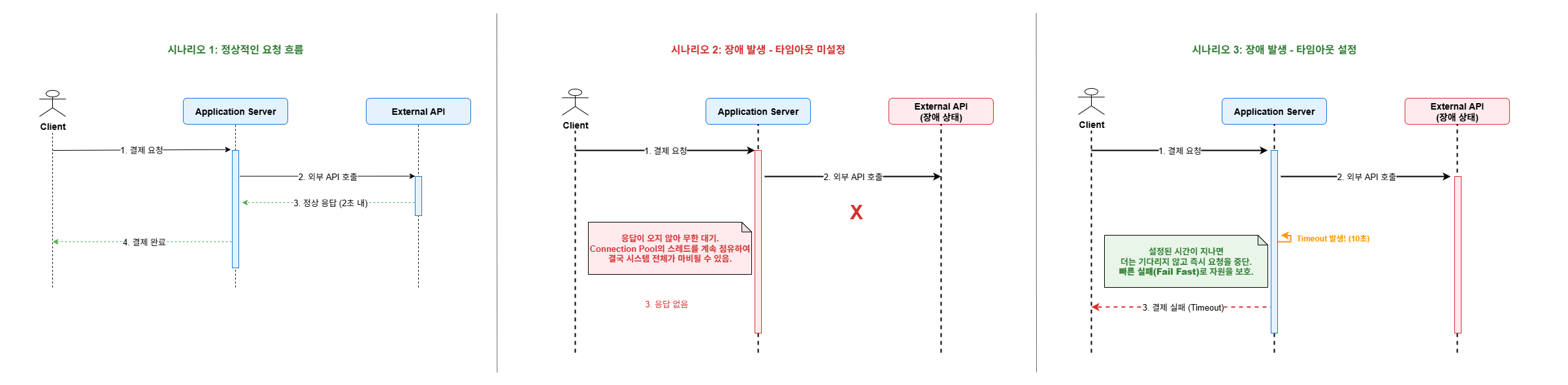 - 타임아웃이 너무 길면: 장애 상황에서 서버 부하가 지속될 수 있음