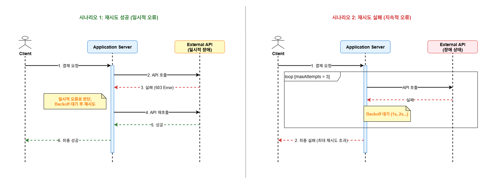 접수 시 발생한 오류들을 보면, 대부분 일시적인 문제였을 가능성이 높다. 이런 상황에서 재시도(Retry)는 문제를 해결할 수 있는 효과적인 방법이다.