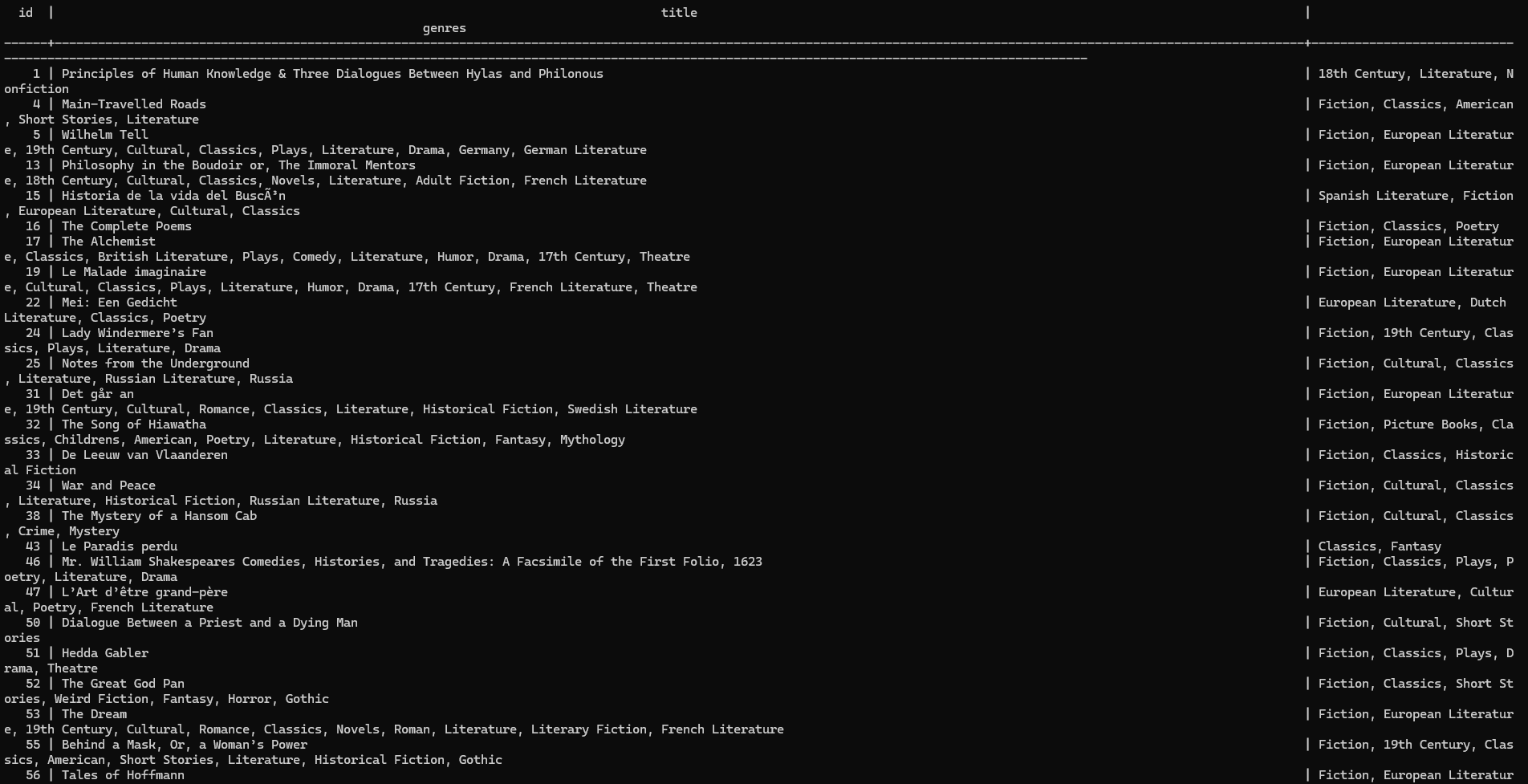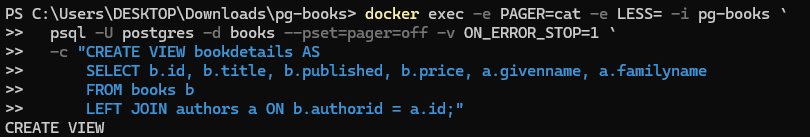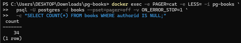 docker exec -e PAGER=cat -e LESS= -i pg-books `