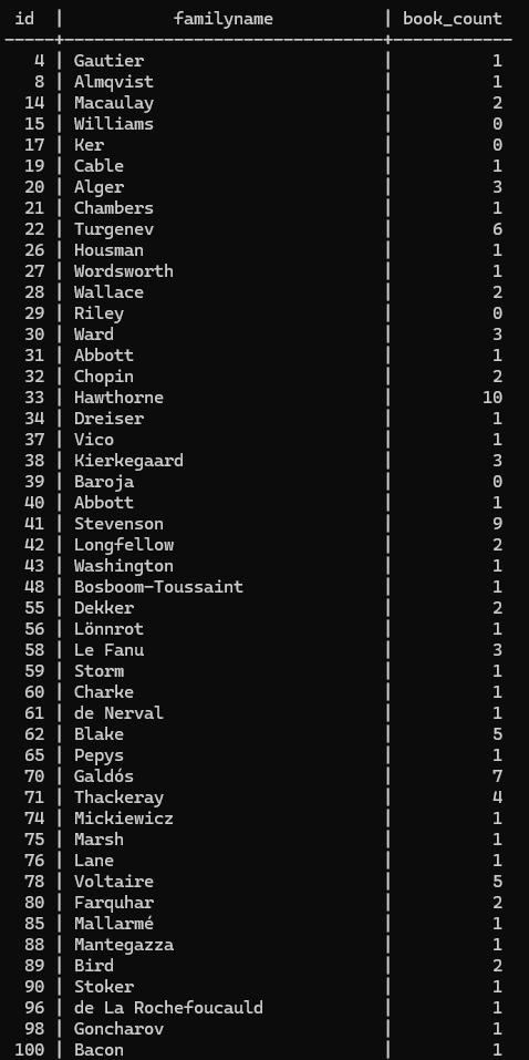 SELECT a.id, a.familyname, COUNT(b.id) AS book_count