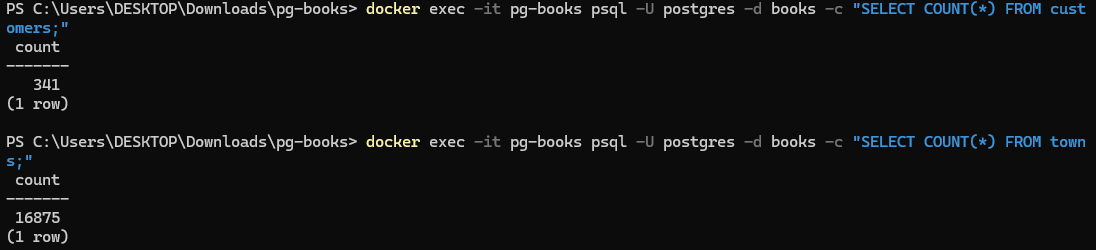 docker exec -it pg-books psql -U postgres -d books -c "SELECT COUNT(*) FROM towns;"