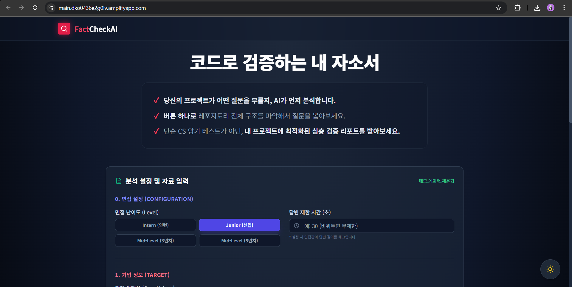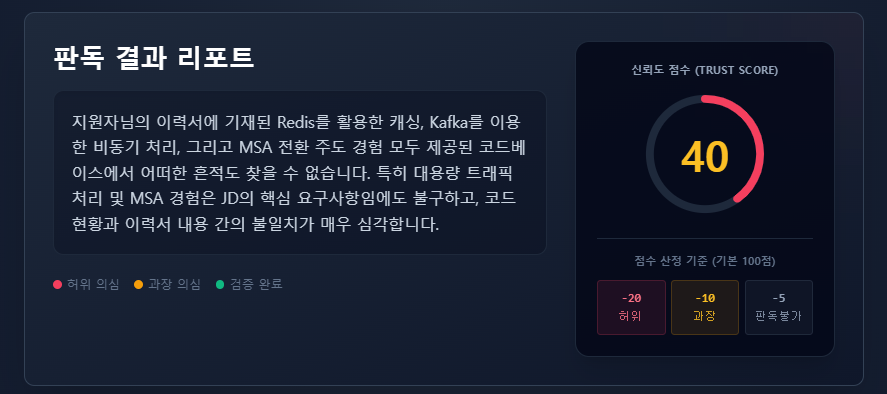 | 기술 신뢰도 | 자소서에 언급된 기술이 GitHub 코드에 실제로 존재하는가? (있으면 80+, 없으면 감점) |