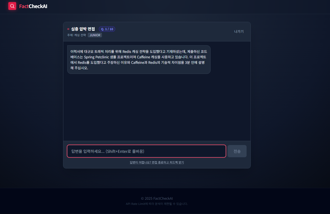 자기소개서와 이력서 검증뿐만 아니라 면접 준비도 할 수 있도록 했는데, 면접 답변을 분석하는 과정에서 예상치 못한 오류가 발생해 이를 수정하는 데 시간이 오래 걸렸습니다. 이전까지 제대로 응답을 했음에도 "잘 모르겠습니다." 라고 하면 바로 0점을 주는 등 고려해야 할 점이 정말 많았습니다. 또한, 단순 압박이 아니라 인턴 레벨에서는 AI가 힌트를 주고 격려하도록 페르소나를 분리하여 구현하기도 했습니다.