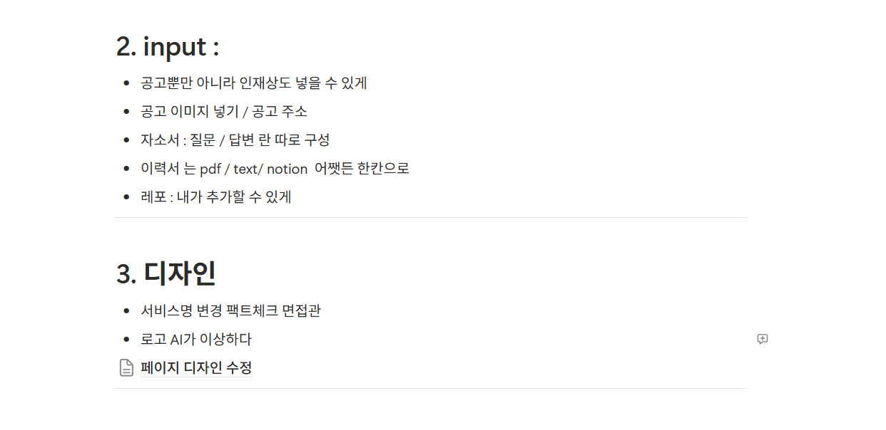 서비스의 주요 타겟이 개발자 취준생이었기 때문에, 팀원들이 각자 서비스를 직접 사용한 후에 사용자 피드백을 문서에 정리했습니다.