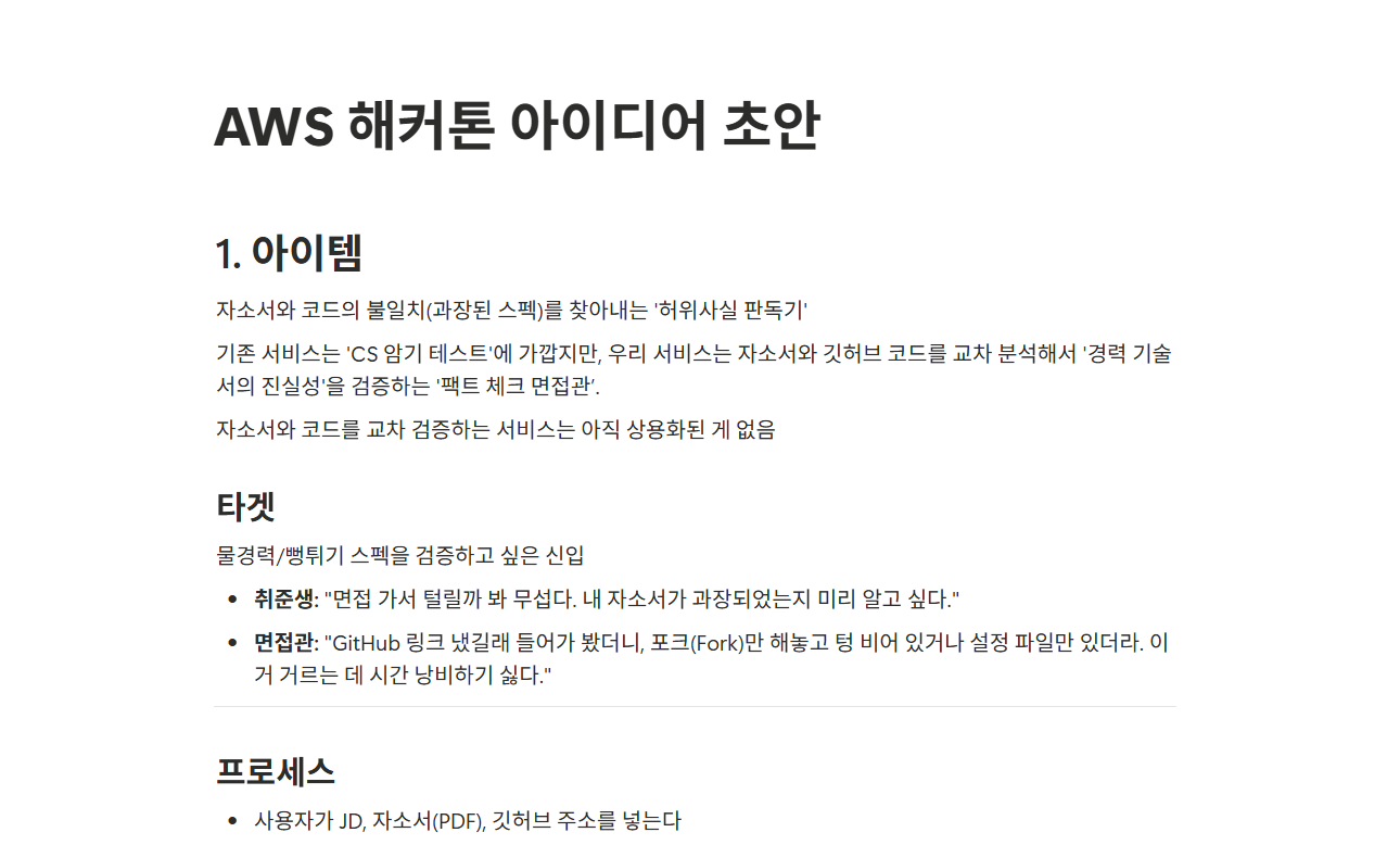 해커톤은 AWS Korea 본사에서 진행되었으며, 채용 공고(JD)를 바탕으로 지원자의 서류와 GitHub 레포지토리 교차 검증하는 기능을 중심으로 개발했습니다.