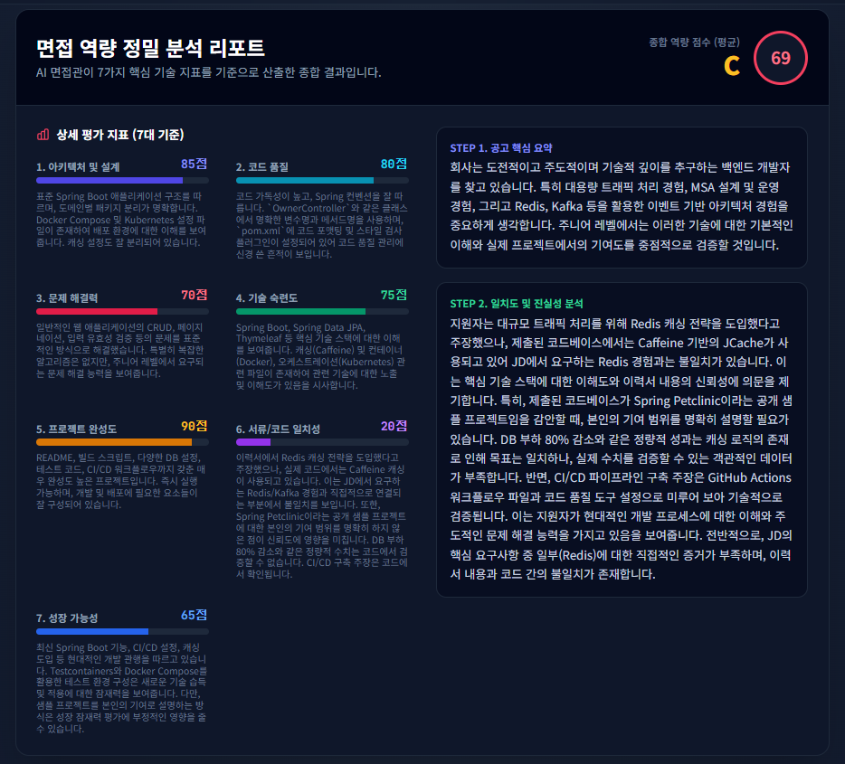 | 직무적합도 | JD의 핵심 키워드(예: MSA, Redis 등)가 코드 베이스에서 발견되는가? |