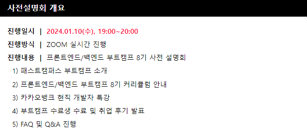 저는 사전 신청을 해서 사전설명회를 들었습니다. 사전설명회 이전에 자기소개서까지 제출하신 분이라면 모두 사전설명회 초대장을 받았을 것입니다. 부트캠프에 대해서만 설명할 줄 알았는데, 생각보다도 더 유익한 내용이었던 것 같습니다.