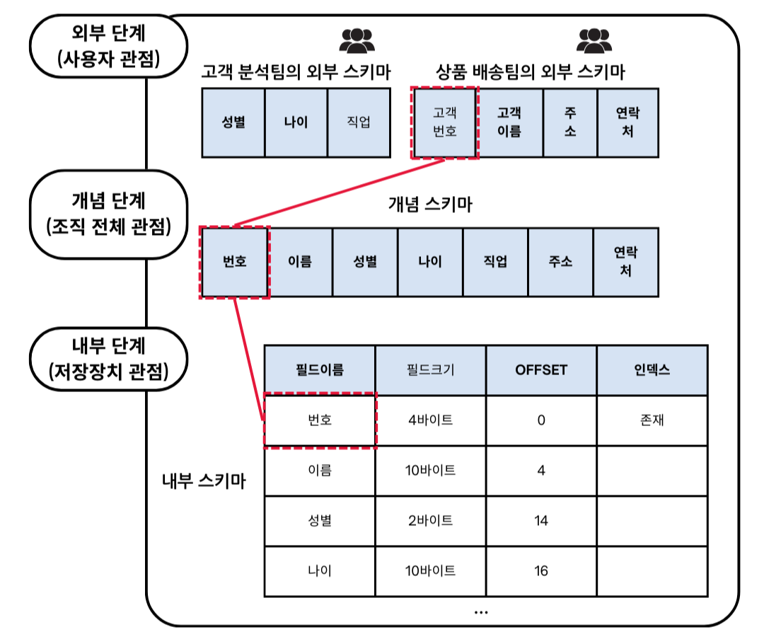 - 내부 스키마: 데이터베이스에 데이터가 어떻게 저장되는지 기술함.
