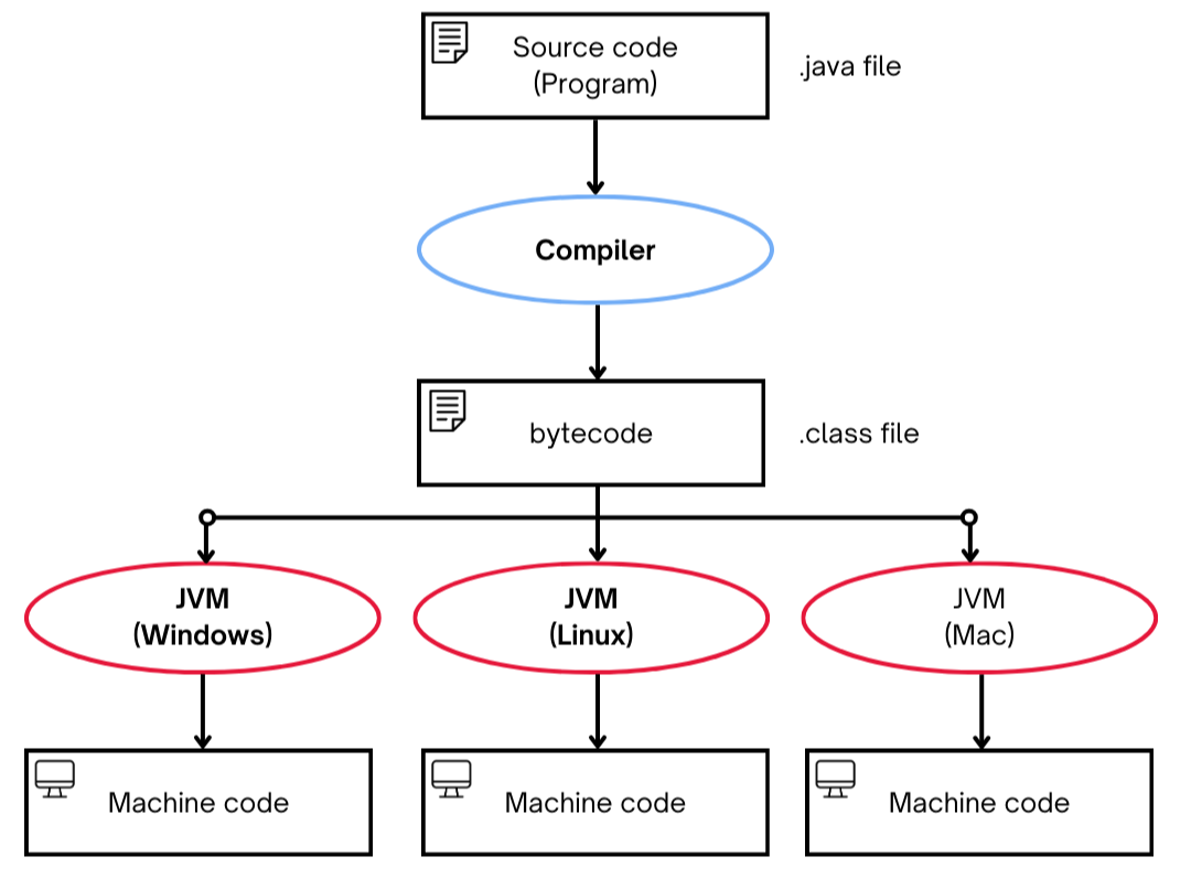 - JVM이 바이트코드를 해석하여 운영체제가 이해할 수 있는 기계어로 변환하여 자바 프로그램이 실행됨.