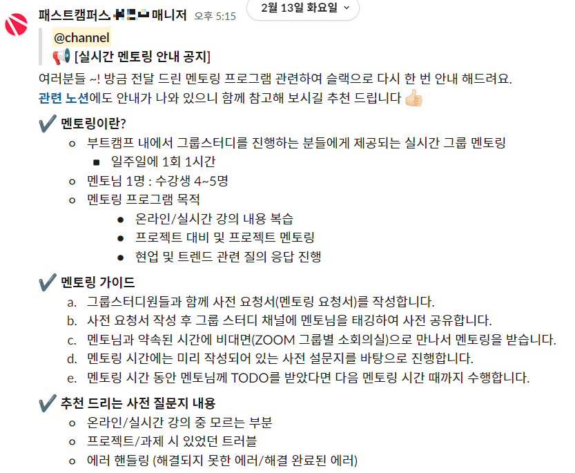 멘토링에 대한 상세 내용은 사진처럼 슬랙과 노션에 자세히 설명되어 있습니다. 사전에 멘토링 요청서를 작성 후 멘토님께 전달드리면 되는 것인데요.