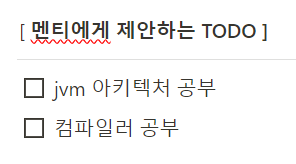 멘토링 요청서 노션의 마지막에는 멘토님께서 작성하는 [ 멘티에게 제안하는 TODO ] 란이 있습니다. 멘토님께서는 저희가 CS 면접 준비를 하기로 해서 그런지, JVM 아키텍처와 컴파일러에 대해 공부하라고 하셨습니다.