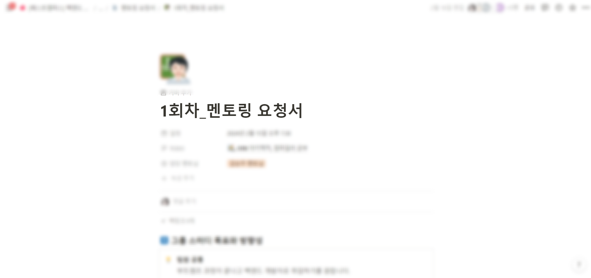 멘토링 요청서는 프로젝트 현황 공유, 멘토링 요청사항, 멘토용 멘토링 노트, 수강생용 멘토링 노트로 구성되어 있습니다. 제공된 템플릿에 맞춰서 멘토님께 드릴 질문을 작성하면 되는데요. 저희는 멘토링이 진행되기 하루 전에 미리 전달드린 상태였습니다.